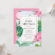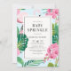 Convite festivo e festivo à aspersão de bebês, com ilustrações de folhas tropicais, flamingo rosa e orquídeas cor-de-rosa, com padrão de bolinhas para o verso do convite. Este convite tropical cor-de-rosa é perfeito para o verão e chás de aspersão de bebês de luau.