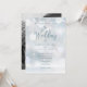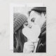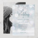 Com tipografia elegante e flocos de neve delicados caindo sobre seus nomes personalizados, data especial e detalhes do evento de celebração do casamento em um fundo de geada de inverno e sua foto especial de casamento no verso. Projetado por Thisisnotme©
