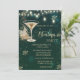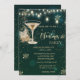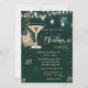 Vidro de champanhe elegante, flocos de neve dourados e luzes de cordas em fundo verde. Estes belos convites de Natal são perfeitos para convites de festas de janto de Natal, troca de presentes de Natal, arrecadadores de fundos de Natal, convites de bolas de Natal e outros eventos realizados durante o mês de dezembro. Use apenas os campos modelo para adicionar suas próprias informações de evento.