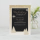 Este convite de festa de fim de ano elegante e glamoroso apresenta uma moldura brilhante com brilho dourado e uma área de texto preta. O gradiente de brilho dourado aparece mais denso perto do topo e gradualmente desaparece em direção à parte inferior. Dois flocos de neve brilhantes são colocados na parte superior dos convites com pinheiros de inverno colocados ao longo da parte inferior.