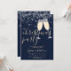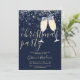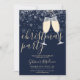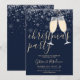 Um convite de festa de Natal elegante com taças de champanhe, flocos de neve e nome em letra de assinatura. Este convite sofisticado pode ser personalizado com suas informações em letras elegantes em um fundo azul de inverno. Criado por Thisisnotme©