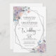 Convite de casamento lindo de primavera ou verão com buquês de flores silvestres boho em aquarela pastel em tons de roxo, violeta, lilás, lavanda, azul poeirento, pêssego, rosa rosado e verde sage e acentuado com tipografia de texto em carvão cinza e uma moldura geométrica em cinza prata. Entre em contato com o designer ANTES DE COMPRAR via Zazzle Chat ou makeitaboutyoustore@gmail.com para modificações no design, ajuda com personalização ou transferência do design para outro produto ou itens coordenados.