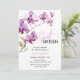 Elegante orquídea roxa de cor d'água em um convite de aniversário de pano de fundo branco. Fácil personalização para detalhes de nome, idade e evento para atender às suas necessidades.