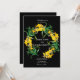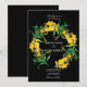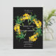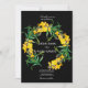 Um simples e elegante convite de casamento feito de flores silvestres em cores brilhantes e alegres O convite apresenta a formação de flores em forma de circular, florescente, com fundo preto.