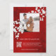 Galinhas brancas florescem ramos e duas borboletas com um fundo brilhante vermelho. Convite de casamento no estilo japonês. Com um código qr digitalizável para o seu site de casamento e uma foto personalizada no fundo.