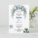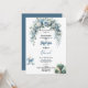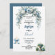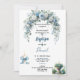 Um convite elegante e moderno para o batismo floral azul que inclui um Font, uma Vela Baptisma e uma Vara com fita azul no verso. Também os campos de texto modelo que permitem adicionar nomes de pais, cerimônia, recepção e rsvp.