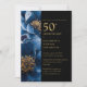 Este convite de aniversário de casamento de 50 anos em azul naval floral preto e dourado pode ser personalizado com suas informações em tipografia moderna. Criado por Thisisnotme©