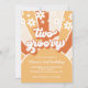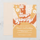 convite de primeiro aniversário inspirado no Retro Groovy Sunshine com margaridas estilo anos 70 e fontes e cores boho.