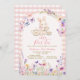 Featuring a pink gingham border, watercolor bunny and teapot, fluttering butterflies, and a garden of pastel wildflowers, this design brings soft charm and whimsy to your celebration.
