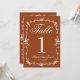 Classy and elegant botanical floral white and burnt orange wedding table numbers. As you see it features a rust old money background with white script that match the whole suite. And white outline floral frame.