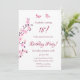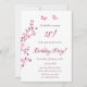 Este convite de aniversário feminino apresenta flores de cereja rosa bonito e borboletas bonitinhas em um fundo branco. Este intrincado trabalho de arte mostra florais japoneses no florescimento do cheio para o seu partido temático primavera asiático.