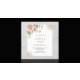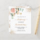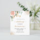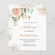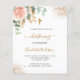Um fundo branco decorado com folhagem de eucalipto, uma rosa em ouro rosa e rosa velho, e folhas douradas e gotas de brilho falso dourado. Personalize com o nome da criança e detalhes da cerimônia. Letras pretas e douradas.