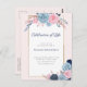 Um design floral elegante com rosas em tons de rosa, azul-marinho e azul empoeirado, sobre um fundo rosado.