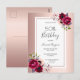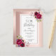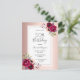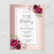 Na frente: um fundo rosa dourado cônico não é metálico com uma simples estrutura rosa-dourada e branca. Decorado com flores, rosas em burgundy. Modelos para o seu nome e detalhes da sua festa. O nome e o texto: 50º (ou qualquer idade) Aniversário são escritos com uma escrita à mão, letras cinzas escuras e coloridas. Fundo: rosa dourado falso fundo metálico.