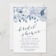 O chá de panela floral elegante e moderno apresenta um buquê de rosas de aquarelas, peônias e híbridos em tons suaves de azul, com folhas botânicas verdes e escamosas e eucalipto. Personalize com os detalhes do seu chá de panela em elegantes enfumaçados com letras azuis acentuadas com caligrafia de estilo manuscrito.