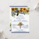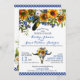 O design de cartão wedding inspirado floral boémio do convite com o crânio da vaca do longhorn da aguarela com penas, os girassóis, as flores selvagens e o guingão azul verificam a beira.