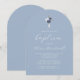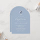 Este elegante convite para batismo em forma de arco apresenta um buquê de aquarela de flores azuis e marinhos poeirentas e folhagem prateada numa cruz de folha de folhas prateada, acima das palavras "junte-se a nós para o batismo do nosso filho" em elegante caligrafia branca e itálico num fundo azul poeirento. Personalize-o com o nome no script branco e os detalhes na fonte sans serif. A parte traseira da placa é azul empoeirado sólido. Ideal para o batismo de um menino.
