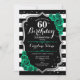 60º Convite de aniversário. Elegante design verde-esmeralda floral com prata brilhante e rosas. Apresenta faixas pretas e brancas e fontes de script. Perfeito para uma comemoração de dia das mulheres na moda. Pode ser personalizado para qualquer idade! Impressos convites Zazzle ou modelo de impressão digital instantânea para download.