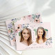 Este convite de festa de formatura moderno e elegante apresenta um fundo rosa corado suave com duas formas geométricas contendo suas próprias fotos e espaço para o ano de formatura e nome. O convite também é decorado com belas rosas cor-de-rosa e pêssego em aquarela e muitas folhas e folhagens verdes e azuis. O verso do cartão contém uma coroa de flores em aquarela correspondente e espaço para todas as informações da sua festa para os seus convidados.