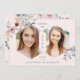 Este convite de festa de graduação moderno e elegante apresenta um fundo rosa corado suave com duas formas geométricas contendo suas próprias fotos e espaço para o ano de sua turma e nome. O convite também é decorado com belas rosas em aquarela rosa e pêssego e muitas folhas e folhagens verdes e azuis. O verso do cartão contém uma grinalda de aquarela correspondente e espaço para todas as informações da sua festa para seus convidados.