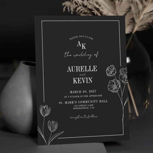 Floral Line Art Rustic Black Elegant Wedding Invitation