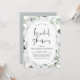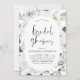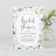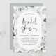 Convites de Chá de Noiva de Primavera ou Verão com Rosas Brancas Florais e Folhagens Botânicas de Eucalipto em Aquarela - inclui uma tipografia de roteiro bonita e elegante com flores botânicas tropicais modernas e folhagens para a celebração especial do casamento.