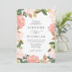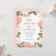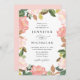 Convites florais elegantes com detalhes de casamento enquadrados por rosas de cor-de-água rosa e tulipas embebidos com folhas verdes e de cobre. Os convites florais de casamento revertem para um fundo cor-de-rosa claro. Projetado para coordenar com a nossa coleção de casamento Blush Primavera Floral.