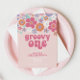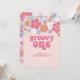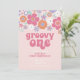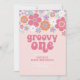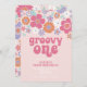 Groovy One! Convite de primeiro aniversario inspirado retroativamente com fontes e cores estilo 70, Floral em cores rosa brilhante e roxo.