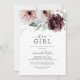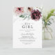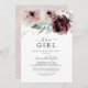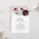 Este romance floral é um convite de chá de fraldas feminino é perfeito para um chá de fraldas elegante. A moderna design do bico rústico apresenta flores românticas a aquarela em tons macios de burgundy, mauve, rosa-pincel e branco-creme com folhas verdes.