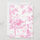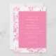 Este convite refinado rosa e branco exibe uma elegante borda floral inspirada em toile e um centro nítido e minimalista para os detalhes do seu casamento. Uma tipografia lindamente equilibrada combina uma fonte cursiva graciosa com letras serif clássicas para um sentimento atemporal e romântico. Totalmente personalizável com seus nomes, data e local do casamento, este design é perfeito para anunciar sua celebração com estilo. Uma escolha ideal para casamentos tradicionais, de jardim ou à beira-mar, definindo a primeira impressão perfeita para o seu dia especial.