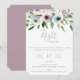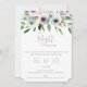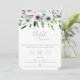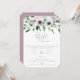 Convite de celebração da Noite Anterior. Cartão apresenta um buquê floral de jardim elegante em tons elegantes de branco, roxo e verde. Design de tipografia moderno e sofisticado. Verso do cartão, mostrado em sombras roxas, pode ser personalizado.