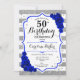 Elegante, floral, 50º aniversário feminino com sua foto no final do cartão. Glam branco, design azul real com prata brilhante falso. Apresenta faixas, rosas azuis safiras, fonte de script e confetti. Perfeito para uma festa de comemoração de na moda adulto. Personalize com seus próprios detalhes. Pode ser personalizado para qualquer idade! Impressos convites Zazzle ou modelo de impressão digital instantânea para download.