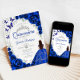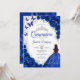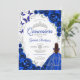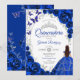 Royal blue silver and white floral Quinceanera celebration invitation. Features brunette girl in ball gown dress, script font, silver butterflies, watercolor roses and tiara. Perfect for an elegant princess style glam celebration. Personalize with your own details. Printed Zazzle invitations or instant download digital printable template.