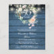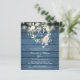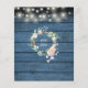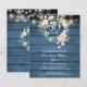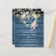Com uma delicada guirlanda de rosas florais em aquarela e luzes de corda bonitas em um fundo de painéis de madeira azul, este convite rústico chic para aniversário de casamento de 50 anos pode ser personalizado com as informações do seu aniversário especial. O verso apresenta uma guirlanda floral correspondente emoldurando as datas do aniversário em texto elegante em um fundo de painéis de madeira. Criado por Thisisnotme©