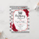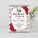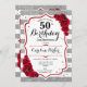 Elegante, floral, 50º aniversário feminino com sua foto no final do cartão. Glam branco, design vermelho com falso brilho prateado. Recursos stripes, rosa vermelha, fonte de script e confetti. Perfeito para uma festa de comemoração de na moda adulto. Personalize com seus próprios detalhes. Pode ser personalizado para qualquer idade! Impressos convites Zazzle ou modelo de impressão digital instantânea para download.