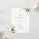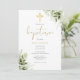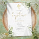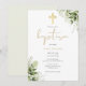Com folhas verdes delicadas pintadas à aquarela e um elegante crucifixo dourado, este convite de batismo neutro e elegante pode ser personalizado com as suas informações especiais. Concebido por Thisisnotme©