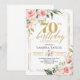 Celebre o jubileu de ouro da sua vida com o nosso Convite de Aniversário de 70 anos com Rosas Cor-de-Rosa, Folhagens de Eucalipto e Moldura Dourada Boho. Desfrute de uma mistura etérea de rosas cor-de-rosa, folhagens de eucalipto exuberantes e molduras douradas elegantes. Este design introduz um sentido de elegância clássica misturada com um toque boêmio, representando perfeitamente a graça e o charme que vêm com setenta anos gloriosos de vida. A paleta de tons suaves de rosa e verde harmoniza-se com a riqueza da moldura dourada, exalando uma estética atemporal perfeita para a sua celebração especial.