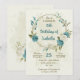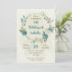 Convites de festa de aniversário românticos e bonitos com flores azuis e brancas e algumas folhas verdes bonitas.