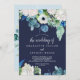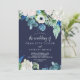 Este clássico convite para casamento de marinhos de flores brancas é perfeito para um casamento outono. O elegante design floral apresenta marfim macio e rosas brancas, peonias e crisântemo com toques de flores azuis e de aquarela azul-piscadela e folhagem verde sobre fundo azul escuro.