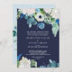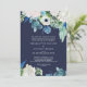 Este clássico convite de casamento tradicional para marinhos de flores brancas é perfeito para um casamento outono. O elegante design floral apresenta marfim macio e rosas brancas, peonias e crisântemo com toques de flores azuis e de aquarela azul-piscadela e folhagem verde sobre fundo azul escuro.
