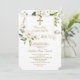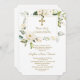 Design de cartão elegante, com um quadro branco delicado, de cor aquosa, com flores natas, uma cruz de ouro falsa; no separador floral traseiro, buquê floral e iniciais, sobre fundo branco. No buquê das flores brancas. Use a ferramenta Personalizar para adicionar suas informações, alterar fontes, cores da fonte. Para encontrar itens, por favor, visite minha Santa Coleção de Comunhão.