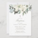 Convide familiares e amigos para celebrar um batismo com este convite elegante, com flores brancas em aquarela e folhagens.