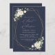 Convide amigos e família de estilo e dê o tom para o seu dia especial com este charmoso convite de aniversário. Design apresenta flores brancas de aquarela, verde e estrutura dourada sobre fundo azul marinho.