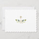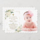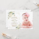 Design de cartão elegante com cantos de flores brancas delicadas, cor d'água, um falso quadro de brilho dourado, confetti, cruz dourada falsa, divisor floral, foto do seu bebê (fácil de ser adicionado) em um fundo branco. Na parte de trás buquê e cruz flores brancas. Use a ferramenta Personalizar para adicionar suas informações. Para obter itens correspondentes, visite minha coleção de fotos Baptism.
