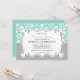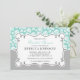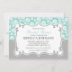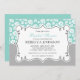 Este convites de chá de panela apresenta rosas brancas sobre um fundo aqua na metade superior do convite e a metade inferior é uma cor de cinza de luz sólida. Um quadro branco giro e giro com uma borda preta no centro apresenta texto personalizável para que você adicione os detalhes do chá de panela.