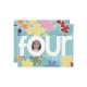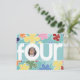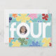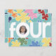 Realce seu lindo filho de quatro anos no "O" para "quatro" neste convite. Flores coloridas, grosseiramente esboçadas, fazem um fundo adorável. Adicione a fotografia do seu filho e personalize as informações no verso para tornar o quarto aniversário do seu filho um inesquecível! Disponível em outras opções de cores com postagem e favores correspondentes. Alguma arte cortesia do KeepDesigning.
