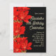 O amarilis preto e vermelho floresce o convite de aniversário de inverno. Linda borda vermelha de Amaryllis no papel preto com modelos de texto de nódulo. Personalize a redação para uma comemoração de aniversário marco para ela. Escolha um papel especial ou escolha a opção de download instantâneo e compartilhe on-line. O reverso é preto sólido.