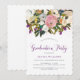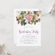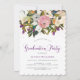 Estes convites para festa de formatura na moda apresentam lindas flores de aquarela em rosa, cinza, branco, roxo e laranja, e um spray de falso brilho rosa. A tipografia violeta elegante diz "festa de formatura". Arte floral por www.createthecut.com.