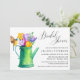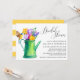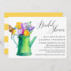 Convites de Chá de Noiva rústicos e modernos com regador de aquarela cheio de tulipas e flores e um pássaro e padrão listrado branco e amarelo no verso do cartão. Esses convites são perfeitos para um chá de noiva com estilo country, fazenda, festa no jardim ou celeiro.