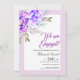 Flores de aquarela roxas - convite para noivados florais lilás. Uma adorável design de casamento que inclui flores aquáticas em tons de roxo e folhas. A frase "Estamos engajados" está na tipografia da escrita.